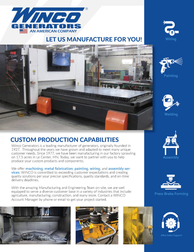 WINCO Generators is a leading manufacturer of generators, originally founded in 1927. Throughout the years, we have grown and adapted to meet many unique customer needs. Since 1977, we have been manufacturing in our factory sprawling on 17.5 acres in Le Center, Minnesota. Today, we want to partner with you to help produce your custom products and components.
