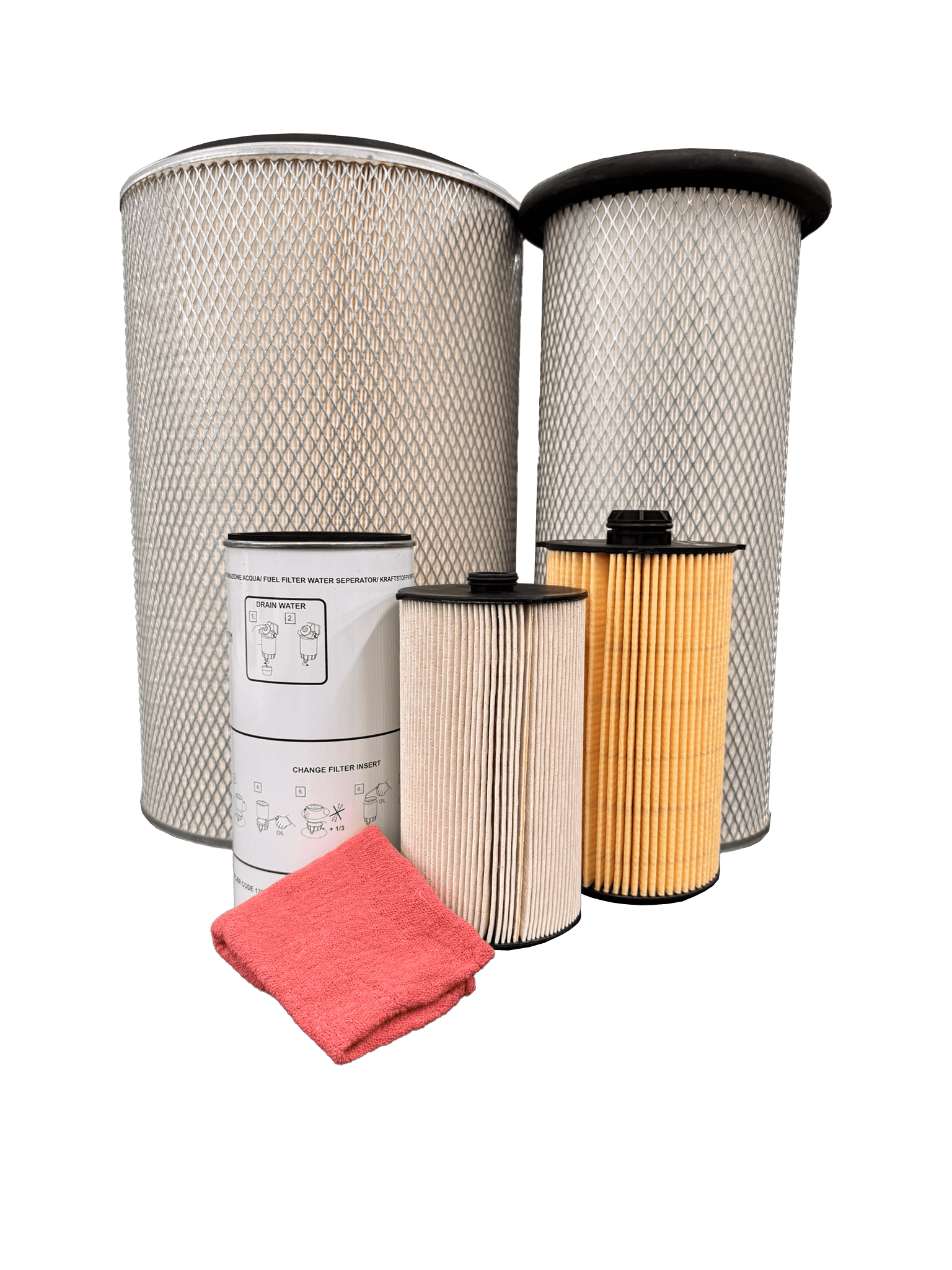 Air filters (inner and outer), oil filter, fuel filter, water separator, and mechanics cloth